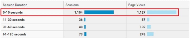 Thống kê trên Google Analytics của 1 website, bạn thấy lượng truy cập ở lại trên website từ 0 – 10 giây chiếm số lượng rất nhiều.