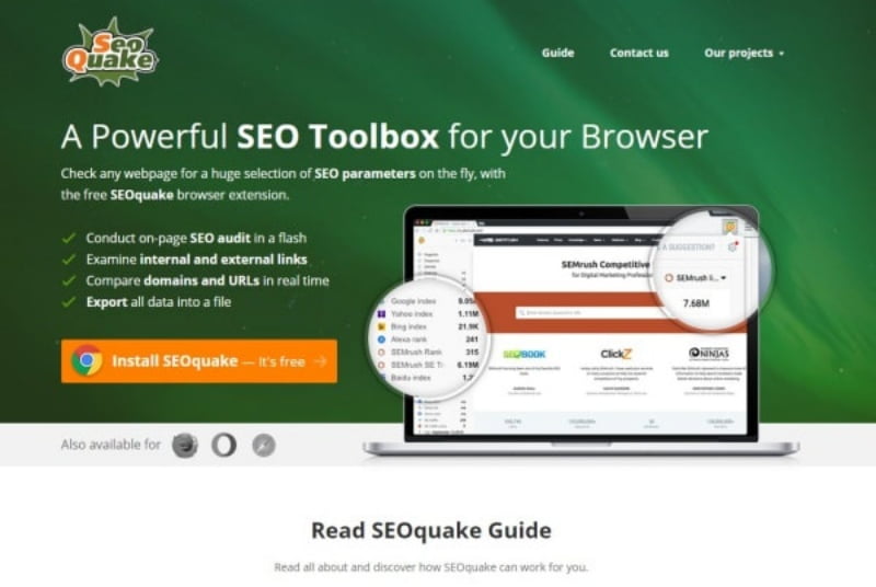 SEOquake là công cụ phổ biến nhất khi làm SEO. Công cụ này không chỉ giúp người làm SEO đánh giá trang website của mình mà còn có thể đánh giá toàn diện mức độ hoạt động của trang web của đối thủ.Đây là công cụ seo hoàn toàn miễn phí và rất hữu ích cho người sử dụng, được cài đặt trên trình duyệt Chrome hoặc Firefox.