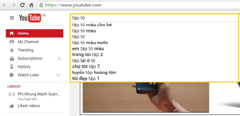 Chỉ cần vào trang chủa của Youtube, gõ một từ khóa mà bạn đang có ý định dùng cho kênh Youtube của mình, một loạt gợi ý sẽ được Youtube đưa ra. Như ví dụ dưới đây, chỉ cần gõ từ “tập tô” thì Youtube sẽ hiển thị ra một loạt những từ liên quan khác.