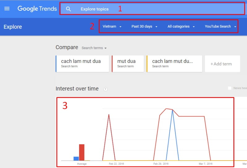 Google Trends đã bổ sung thêm dữ liệu tìm kiếm từ Youtube cho phép chúng ta có cái nhìn tổng thể hơn về những xu hướng tìm kiếm video. Các bạn vào Google Trends, gõ những từ khóa bạn đang có dự định dùng cho video vào ô tìm kiếm ở trên đầu, ngăn cách các từ khóa bằng dấu phẩy, sau đó enter.