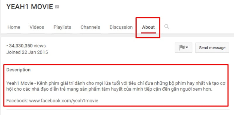 - Thêm phần giới thiệu (About) ,mô tả ngắn gọn cho kênh Youtube của bạn có chứa từ khóa mà bạn định sử dụng cho kênh. Ở phần giới thiệu này, 1-2 dòng về sản phẩm, công ty bạn, không quên thêm các thông tin như Facebook, Twitter, website.