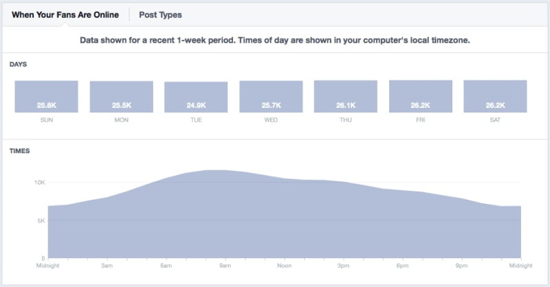 Qua nhiều phiên bản của Insights (cho biết dữ liệu về trang của bạn), Facebook đã giới thiệu một biểu đồ rất hữu dụng mang tên When your Fans Are Online (Khi nào Fan của bạn online) có khả năng thông kê khoảng thời gian có nhiều người Online nhất và khoảng thời gian ít người Online nhất trên fanpage của bạn.