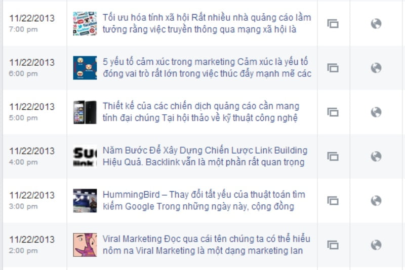 Cứ vài tháng là mình sẽ cập nhật danh sách nội dung cũ còn hot và còn có giá trị, tiếp đó tạo một bảng tính excel để lưu nội dung các bài viết với một số cập nhật mới trên bài viết đó, và cho xuất bản lên Facebook. Mình chọn thời điểm khác nhau mỗi đêm 22:00-02:00, chênh nhau 10 phút cũng được, không nhất thiết phải chuẩn chỉnh 00.