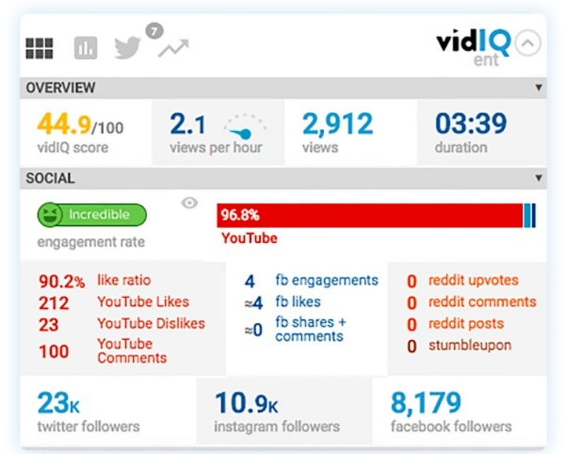 - Nhận số liệu thống kê YouTube – Thẻ điểm của VidIQ cung cấp cho bạn thông tin về tất cả các video được tải lên YouTube.
