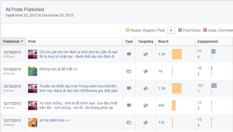 Chúng ta tập trung quan sát lượng Reach thay đổi theo từng post vì trước đây chúng ta từng được ai đó nói rằng không nên đăng quá một bài viết mỗi ngày, và đôi khi thậm chí là chỉ nên đăng 2 lần một tuần. Với lượng bài ít ỏi như vậy, thì lượng Reach của mỗi bài đúng là cả một vấn đề cần quan tâm, vì đơn giản là chúng ta đã đặt hết trứng vào một rổ và rủi ro quá lớn. Nhưng giờ ta sẽ không làm thế nữa, chuyển sang đăng vài post mỗi ngày và lợi ích thu được sẽ cực lớn. Mình quan sát thấy một số trang tin tức còn đăng hơn 15 post mỗi ngày. Với số lượng post nhiều như vậy, thì Reach của từng post sẽ không còn quan trọng nữa. Mục tiêu ở đây là đưa fanpage của chúng ta tiếp cận được với càng nhiều người càng tốt.