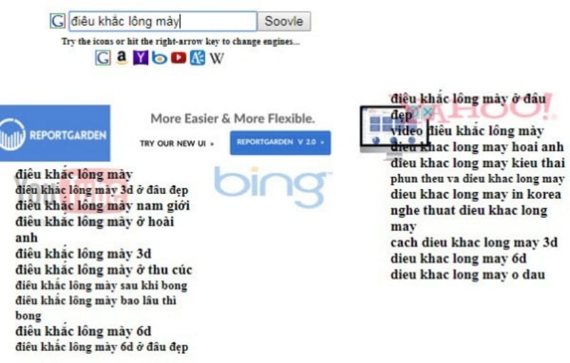 Soovle gợi ý cho bạn khá nhiều từ khoá. Tuy nhiên, với một vài từ khoá tiếng việt, Soovle hoạt động không tốt lắm.