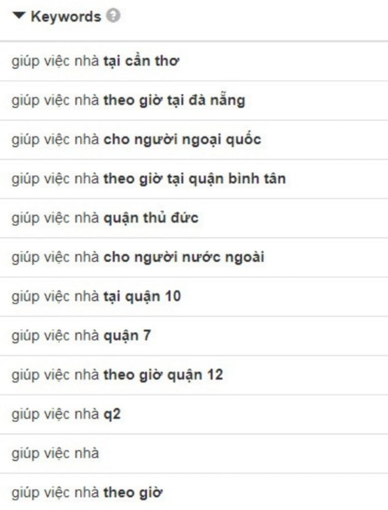 - Các từ khoá thể hiện mục đích muốn sử dụng dịch vụ: giúp việc nhà theo giờ, giúp việc nhà ở lại, giúp việc nhà ban ngày…