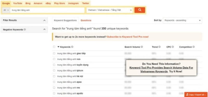 Khi bạn tìm kiếm bất kỳ từ khóa nào trên Keyword Tool.io nó sẽ nhanh chóng đưa ra các kết quả về những từ khóa liên quan đến nội dung bạn tìm trên Google, Youtube, Bing, Amazon, eBay, Play Store, Instagram, Twitter.