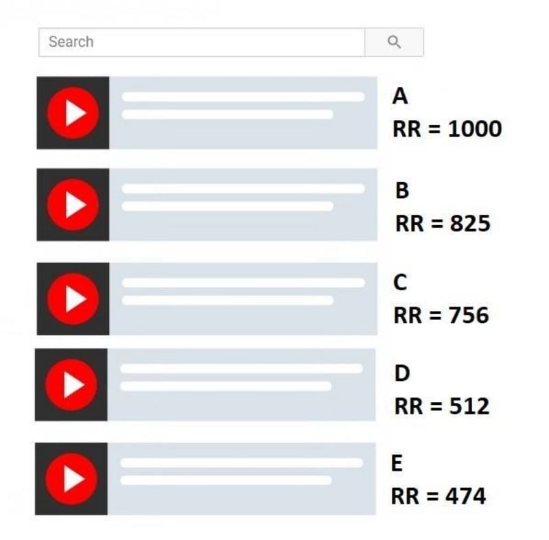 Điểm RR là điểm xếp hạng giữa các Video trong cùng một khung Search. Hãy tham khảo hình sau đây để hình dung điểm RR quyết định thứ tự xuất hiện của video trong khung Search nhé!