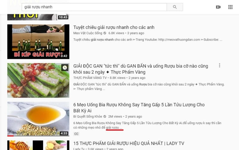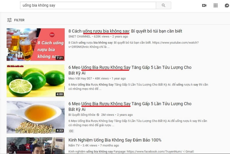 Nếu video này đặt tiêu đề là “uống rượu bia nhanh say…” thì có khả năng video sẽ hiển thị khi người dùng search với từ khóa “uống bia không say”