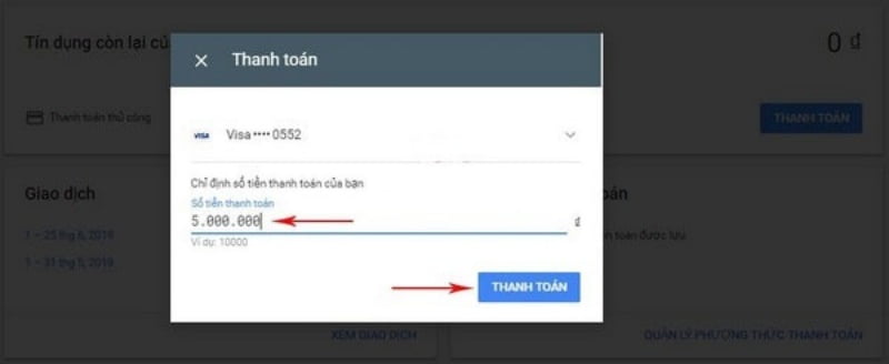 - Bước 5: Nhập số tiền muốn nạp vào tài khoản Google Adwords & chọn Thanh toán.