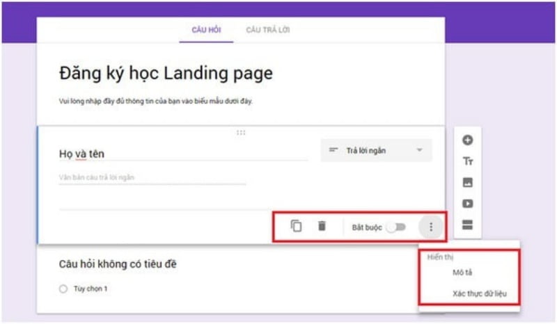 Phía dưới mỗi câu hỏi đều có các nút công cụ khác như Nhân bản câu hỏi, Xóa, Bắt buộc (chọn vào đó nếu đây là câu hỏi bắt buộc trả lời), Hiển thị mô tả và Xác thực dữ liệu.