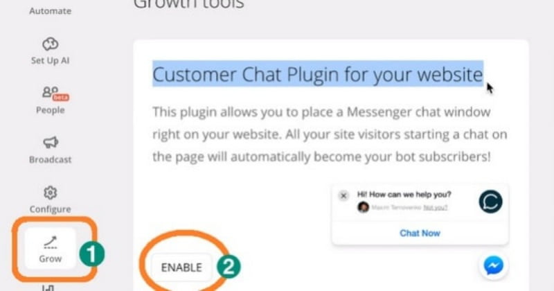 Để tiến hành nhúng code HTML, bạn cần truy cập vào trang Dashboard của Chatfule. Sau đó nhấn Tab “Grow”, nhấn “Enable”.