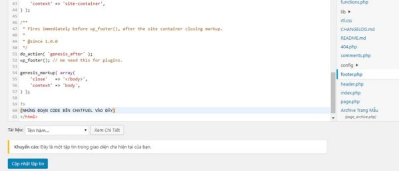 Bạn hãy tìm đến file tập tin có tên “footer.php” của giao diện website bạn đang sử dụng, tiến hành án đoạn code HTML vừa copy vào trước dấu đóng thẻ </html>.