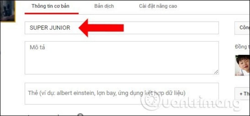 Trong quá trình chờ video được tải hoàn thành lên Youtube, chúng ta có thể tùy chỉnh các nội dung cho video. Phần Thông tin cơ bản hãy nhập tên cho video bạn muốn, nhập mô tả cho video và thêm thẻ cho video nếu muốn.