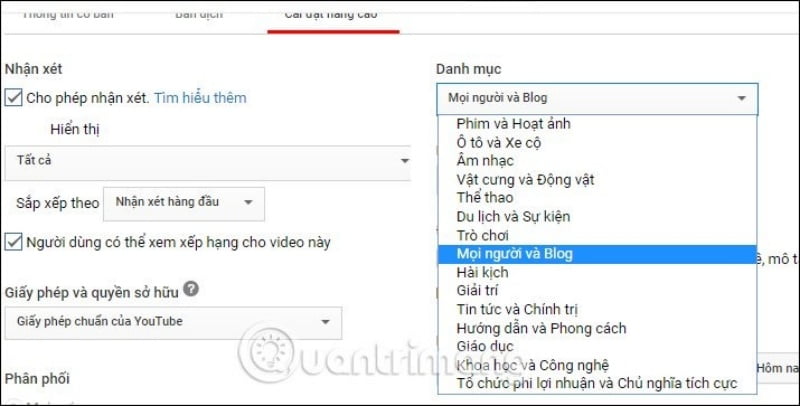 Tiếp tục chuyển sang Danh mục thì chọn mục cho video có trong danh sách mà Youtube cung cấp.