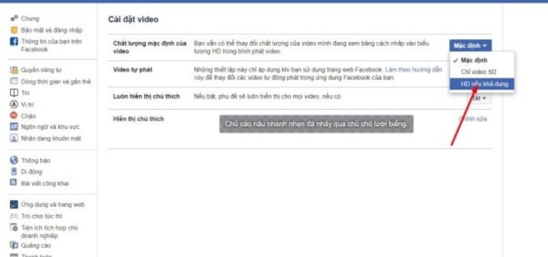 Bước 5: Vào mục Chất Lượng Mặc Định Của Video và chọn HD Nếu Khả Dụng