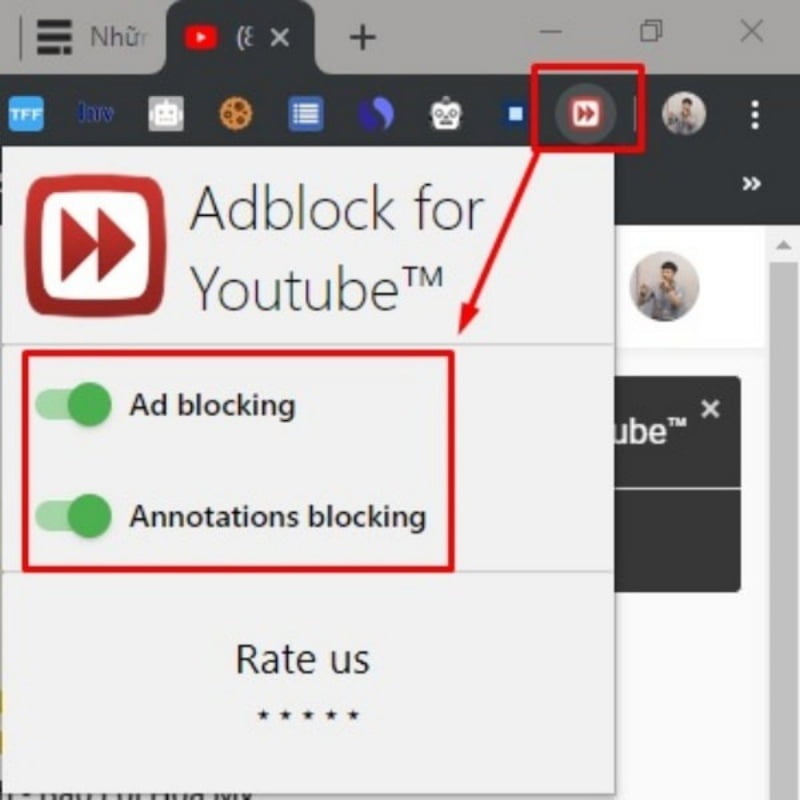 Bây giờ bạn chỉ cần mở 2 chế độ Ad blocking và Annotations blocking lên là xong.