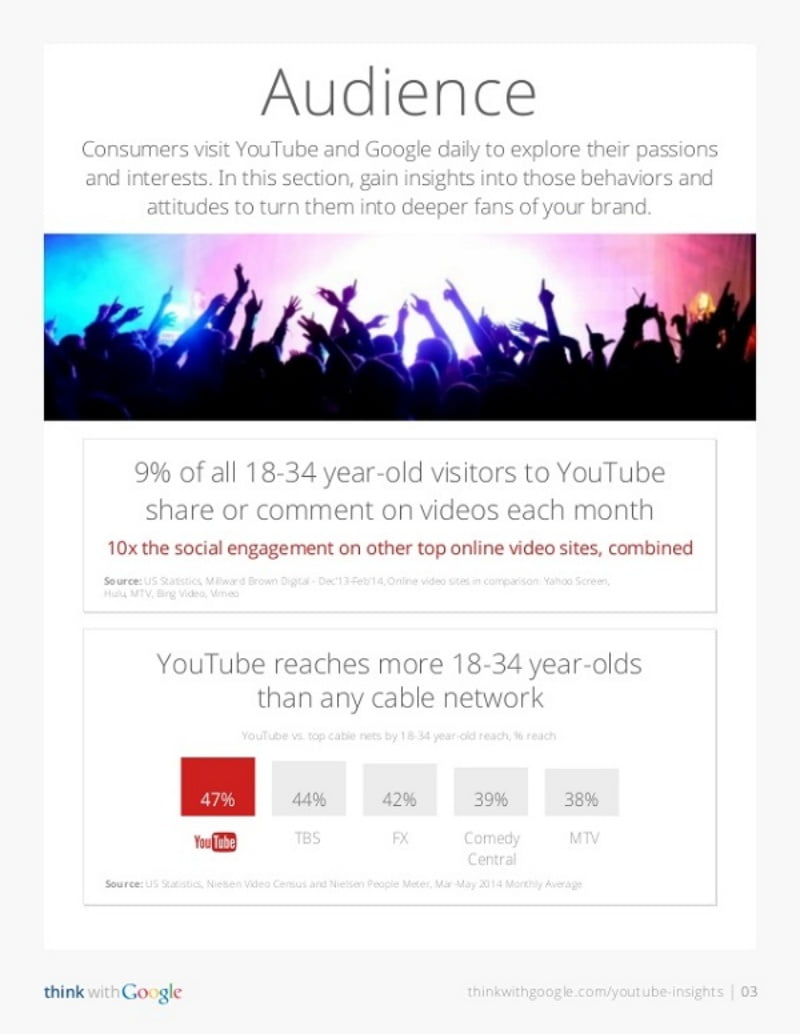Bên cạnh đó là nghiên cứu độ tuổi tham gia YouTube tập trung ở nhóm 18-34 tuổi. Họ chú yếu sử dụng các thiết bị hiện đại như smartphone, máy tính bảng… để tương tác trên YouTube. Có khoảng 9% lượng khách hàng từ 18-34 tuổi chia sẻ hoặc bình luận trong những video trên YouTube mỗi tháng. Gấp 10 lần việc tham gia mạng xã hội trên các trang web video trực tuyền hàng đầu khác.