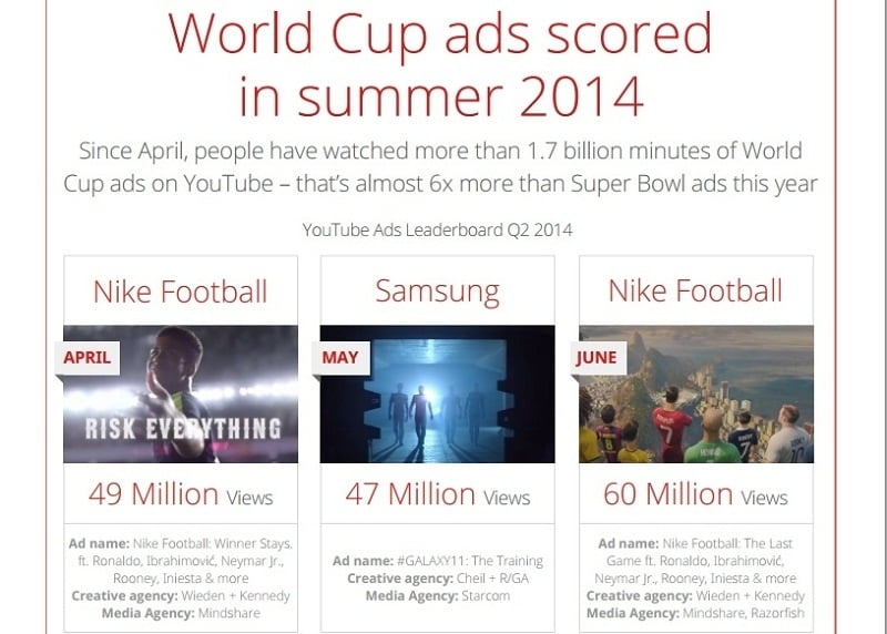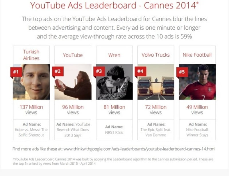 Theo thống kê từ YouTube Ads Leaderboard (Qúy 2 – 2014), Nike và Samsung là hai nhãn hàng thu hút lượt xem cao nhất trên YouTube, lần lượt là 60 triệu và 47 triệu. Trên YouTube, những nhãn hiệu giáo dục định hướng học tập luôn có nhiều subscribers nhất, trong khi những nhãn hiệu đồ ăn thức uống lại vượt trội về lượng người xem nhiều nhất. Ngoài ra, một số thống kê thú vị khác như: PewDiePie là kênh YouTube dẫn đầu trong 5 kênh hàng đầu trên YouTube, Epic Rap Battles là nhà phân phối YouTube lớn thứ 13 với 10 triệu subscribers…