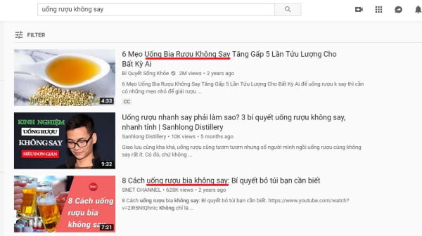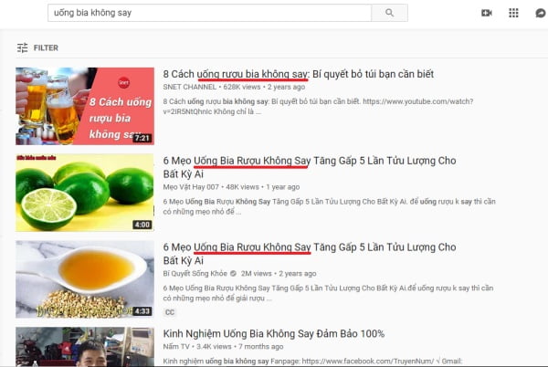 Nếu video này đặt tiêu đề là “uống rượu bia nhanh say…” thì có khả năng video sẽ hiển thị khi người dùng search với từ khóa “uống bia không say”