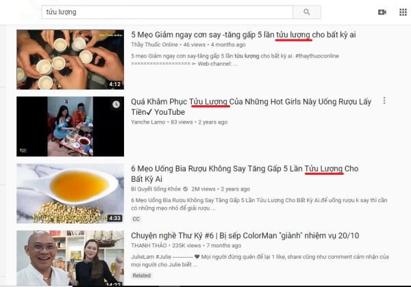 Video uống với từ khóa “uống bia rượu không say” vẫn hiển thị khi search với từ khóa “tửu lượng”, mặc dù nó xếp hạng thứ 10 trong khung tìm kiếm nhưng với 1 tiêu đề chứa nhiều keyword quan trọng sẽ giúp cho video của bạn có nhiều cơ hội nằm trong các từ khóa tìm kiếm.