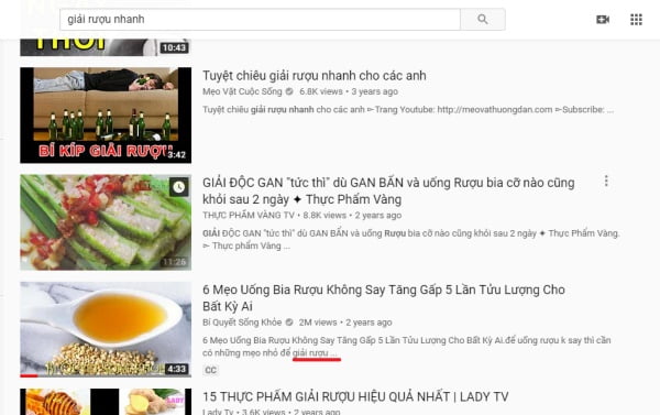 Bạn để ý trong hình trên có một video đặt với tiêu đề là “Uống rượu nhanh say phải làm sao? 3 bí quyết uống rượu không say, nhanh tỉnh”. Video này chỉ hiển thị khi tìm kiếm với từ khóa uống rượu không say còn với từ khóa uống bia không say thì không hiển thị.