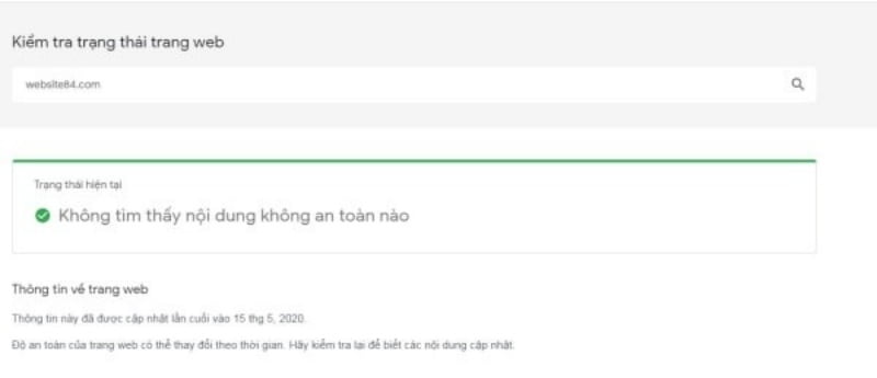 Chẳng hạn, tôi muốn kiểm tra website website84.com của mình có bị lọc vào backlist của Google hay không? Tôi chỉ cần search “http://www.google.com/safebrowsing/diagnostic?site= website84.com“