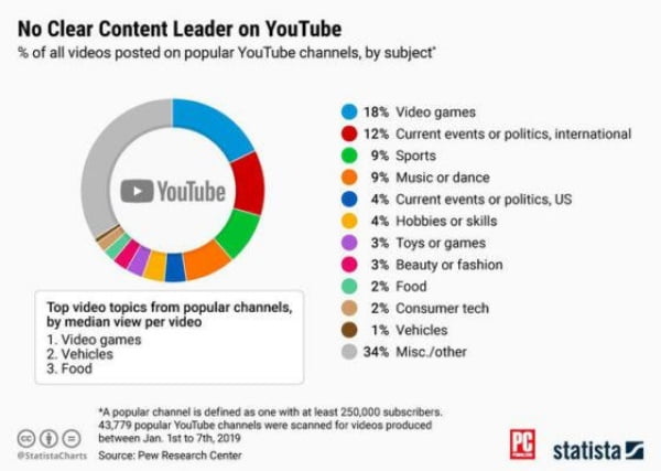 Một nghiên cứu của trung tâm Pew cho thấy không có chủ đề nào giúp những YouTubers đảm bảo được lượng xem. Phần lớn lượt xem dành cho những video về các trò chơi điện tử, nhưng kể cả đối với chủ đề phổ biến nhất này, nó chỉ chiếm 18% tổng số lượt xem.