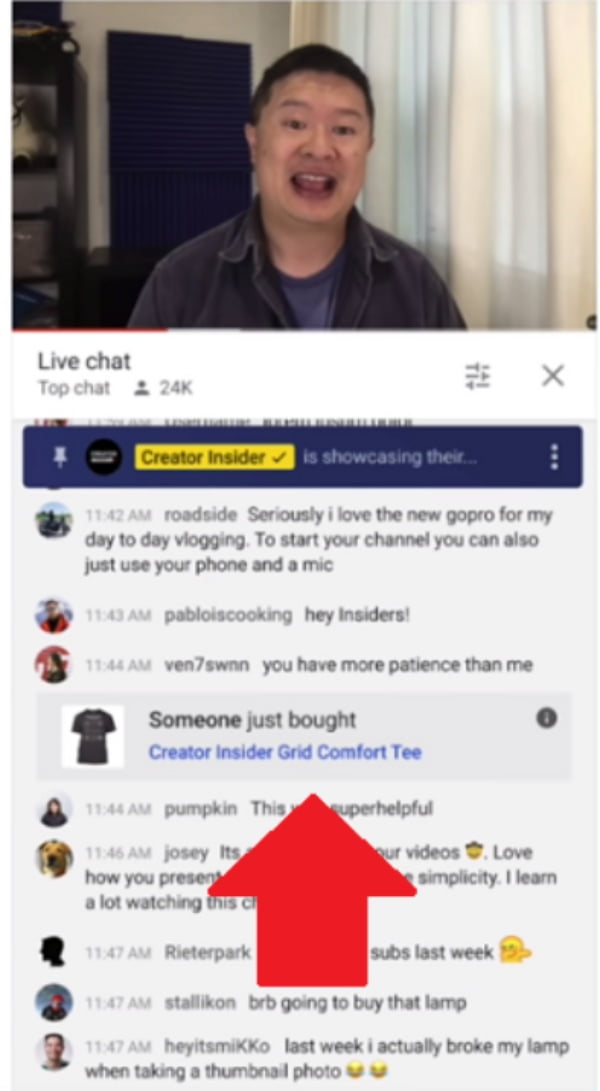 Nhìn vào hình ảnh minh họa ở trên, bất kỳ khi nào có người mua sản phẩm từ cửa hàng tích hợp Teespring trong khi livestream, một thông báo sẽ hiển thị ngay trên mục bình luận của livestream, đi kèm là một đường link để người khác có thể nhấn vào và xem chi tiết sản phẩm. Điều này sẽ giúp các nhà làm nội dung quảng bá được sản phẩm của họ tới cộng đồng người xem, cung cấp thêm một cách để tăng doanh thu thông qua những công cụ của YouTube.