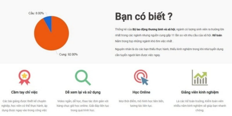 Ví dụ: Hình ảnh bên dưới cho thấy, bằng những số liệu cụ thể và thực trạng mà ngành kế toán đang gặp phải chính là điều mà khách hàng quan tâm. Từ đây sẽ giúp họ thấy khóa học online này vừa có thể đáp ứng được yêu cầu công việc và nhu cầu của họ.
