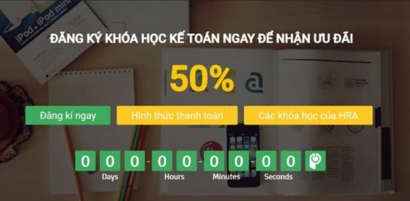 Ví dụ: Nút kêu gọi hành động “Đăng ký ngay” được kết hợp với trình khuyến mãi 50% dễ kích thích khách hàng bấm vào đăng ký khóa học.