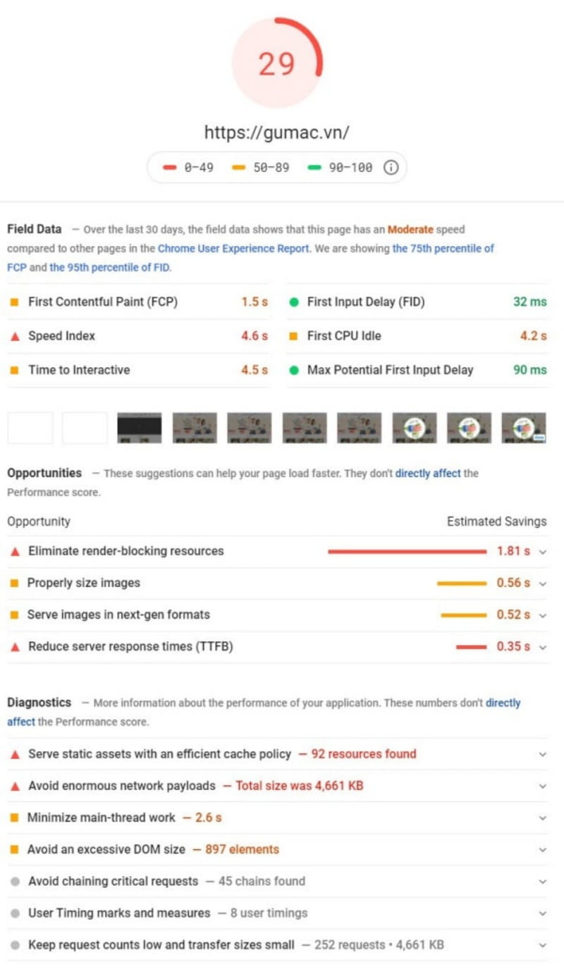Ví dụ: Khi kiểm tra tốc độ tải trang của một website qua Page Speed Insights, nhận được kết quả như ảnh bên dưới. Những thông tin màu đỏ hoặc màu vàng chính là các yếu tố bạn cần tối ưu lại ngay trên website để tăng tốc độ tải trang.